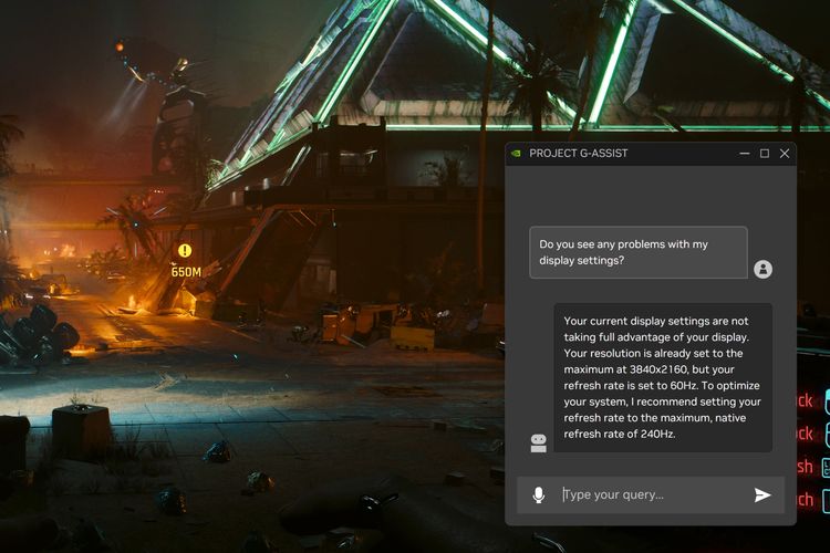 G-Assists pun diperlihatkan dapat memindai sistem dan menyadari jika pengguna hanya bermain pada refresh rate 60Hz,padahal sebetulnya layar monitor sigamer sudah mendukung 240Hz.