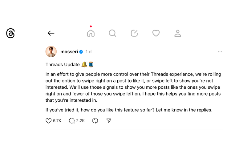 Lewat pengumuman yang dibagikan CEO Instagram,Adam Mosseri,pengguna Threads kini dapat menggeser unggahan ke kanan atau kiri untuk menunjukkan ketertarikan sebuah konten.