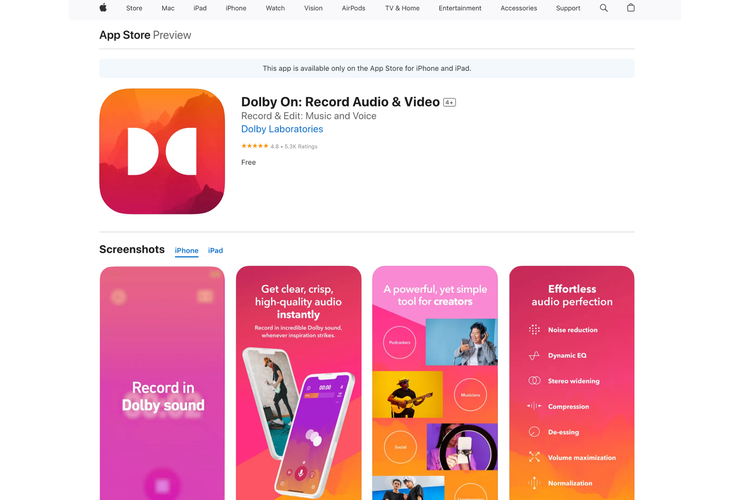 Dolby On merupakan aplikasi perekam suara yang utamanya dirancang untuk merekam musik live. Dengan Dolby On,Anda bisa mendapatkan rekaman musik dengan kualitas studio,dan yang terbaik adalah antarmukanya mudah digunakan. Aplikasi ini cocok untuk siapa pun,baik pemula maupun profesional. Aplikasi ini tersedia untuk pengguna iOS dan Android. Anda dapat mengunduhnya di Google Play Store dan App Store.