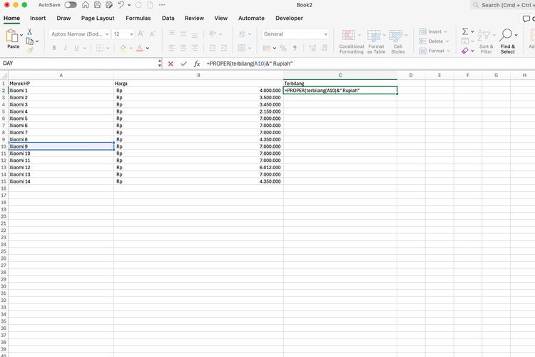 Misalnya saja =PROPER(terbilang(A10)&“ Rupiah”