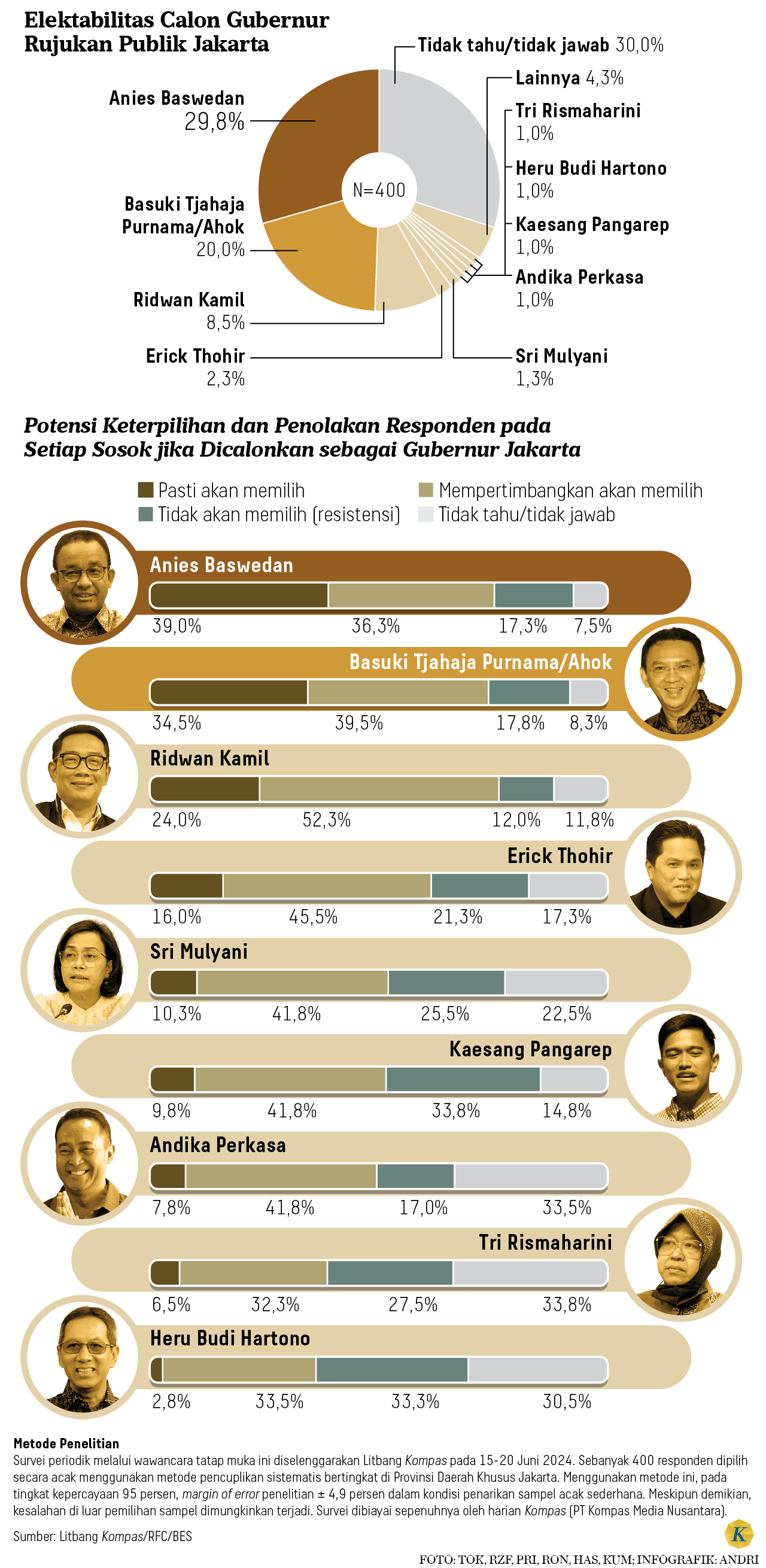 Berdasarkan hasil survei Litbang Kompas periode Juni 2024,sebanyak 29,8 persen responden di Jakarta memilih kembali nama Anies Baswedan sebagai cagub rujukan untuk maju pada Pilkada Jakarta.