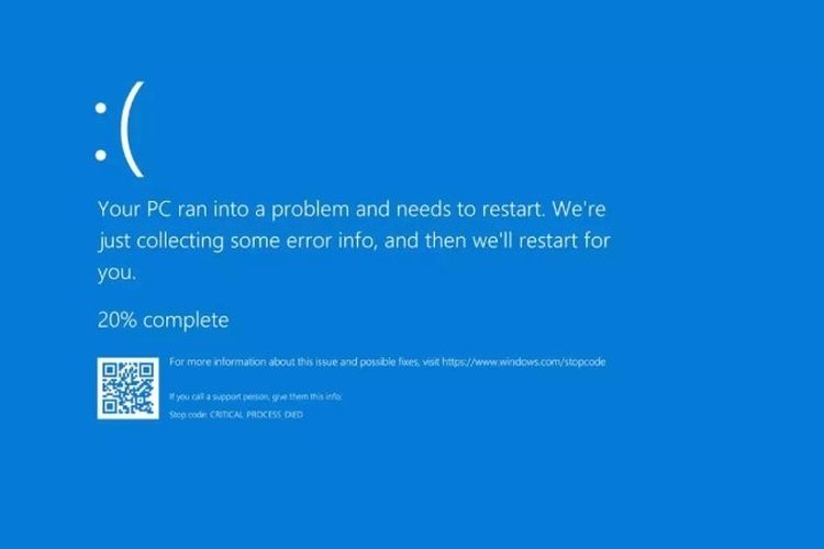 Tampilan sistem Windows menampilkan latar belakang biru dan keterangan teks yang menunjukkan gangguan,sehingga meminta pengguna untuk restart. Tampilan itu juga disebut Blue Screen of Death (BSOD).