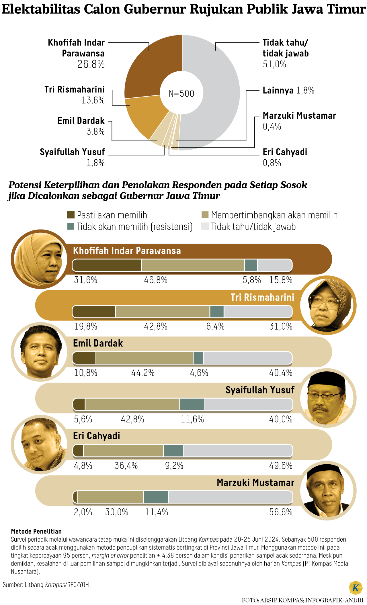 Baca juga: Survei Litbang Kompas Pilkada Jatim 2024: Khofifah 26,8 Persen,Risma 13,6 Persen