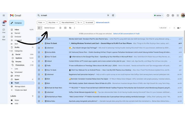 Setelah mengkonfirmasi seluruh penghapusan kotak masuk Gmail,maka pesan-pesan di Gmail akan masuk di folder “Trash”