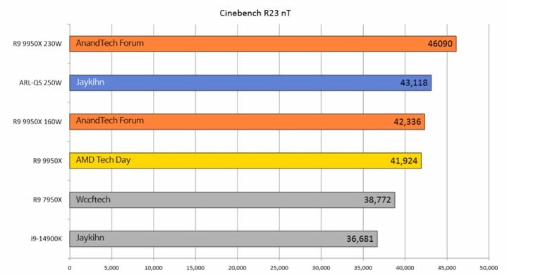 Dibandingkan dengan rivalnya,Ryzen 9 9950X (engineering sample) yang memiliki 16 core performance (P) dan 32 thread dari data pengujian lainnya,unit QS Arrow Lake lebih kencang sekitar 2 persen saat Ryzen disetel dengan daya 160 watt,tapi tertinggal 6,5 persen ketika lawannya itu diberi daya 230 watt.