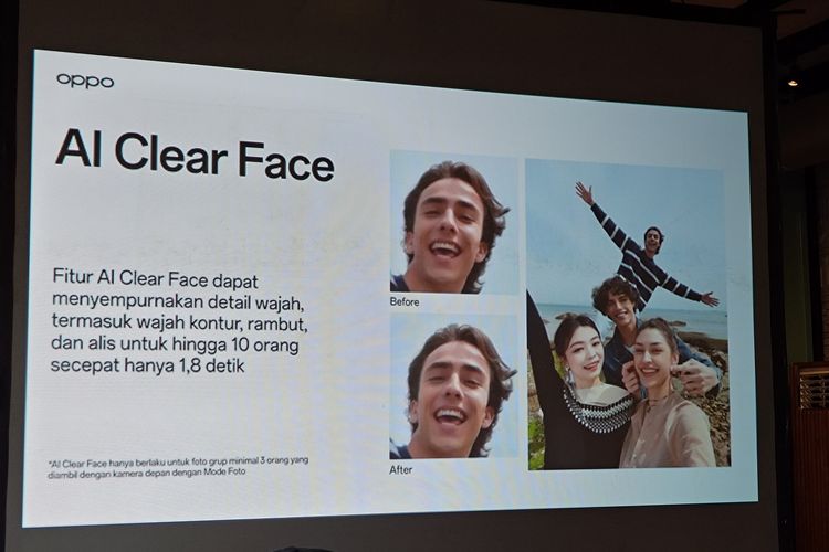 KOMPAS.com/Bill Clinten AI Clear Face merupakan fitur AI yang bisa menyempurnakan detail wajah. Detail wajah yang dimaksud di sini adalah kontur muka,bentuk rambut,tekstur alis,dan lain sebagainya.Fitur ini bisa menyempurnakan detail wajah hingga 10 orang dalam satu foto dengan proses hanya dalam waktu sekitar 1,8 detik.