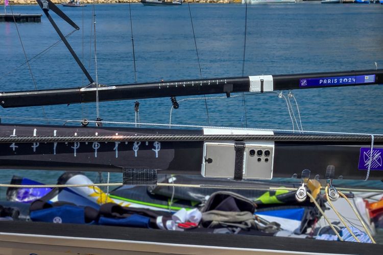 Samsung Newsroom Samsung Galaxy S24 Ultra dipasang di tiang-tiang kapal untuk merekam kegiatan kompetisi berlayar di Olimpiade Paris 2024.