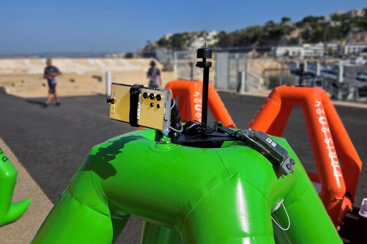 Samsung Newsroom Samsung Galaxy S24 Ultra dipasang di pelampung untuk merekam kegiatan kompetisi berlayar di Olimpiade Paris 2024.