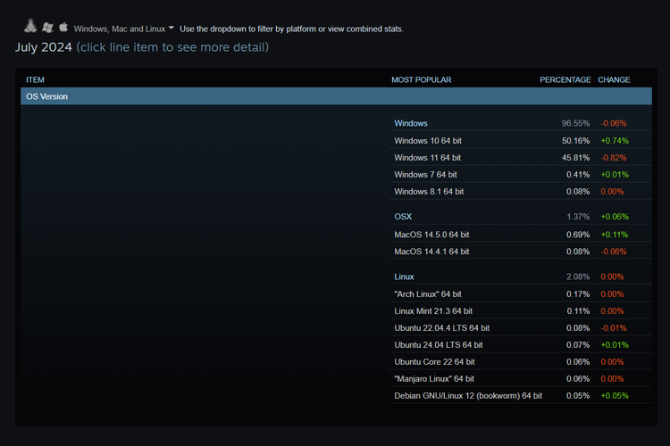 Hal ini terlihat dari survei bertajuk "Steam Hardware & Software Survey: July 2024" dari Steam,platform distribusi permainan video milik perusahaan pengembang game,Valve.