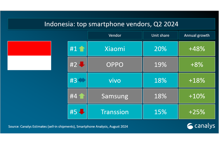 Lebih rinci,lima vendor smartphone teratas di Indonesia kuartal II-2024 versi Canalys adalah sebagai berikut: