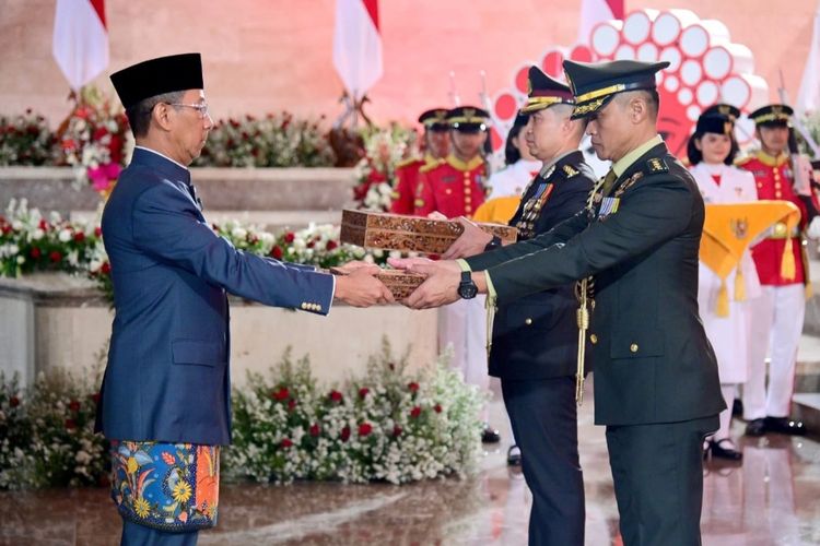 Dok. Sekretariat Presiden Kasetpres Heru Budi Hartono saat menyerahkan duplikat bendera merah putih dan teks proklamasi yang ada di Ruang Kemerdekaan Monas kepada Tim Purna Paskibraka Duta Pancasila,Sabtu (10/8/2024). Penyerahan itu menandai dimulainya proses kirab duplikat bendera pusaka dan naskah proklamasi dari Monas ke Halim Perdanakusuma hingga berlanjut ke IKN.