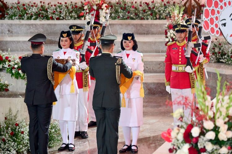 Tim Purna Paskibraka Duta Pancasila yang bertugas sebagai pembawa bendera Merah Putih adalah Kachina Ozora dari Provinsi Kalimantan Tengah.