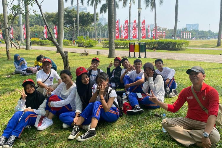 "Kebetulan tadi murid saya ada yang belum pernah ke Monas sama sekali,jadi biarin aja kita main-main di sini dulu," tambah dia.