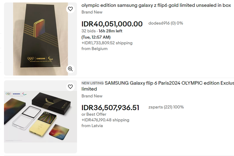 Pantauan KompasTekno Senin (12/8/2024) pagi,hasil pencarian "Galaxy Z Flip 6 Olympic Edition" di situs web eBay.com menampilkan dua laman penjualan.