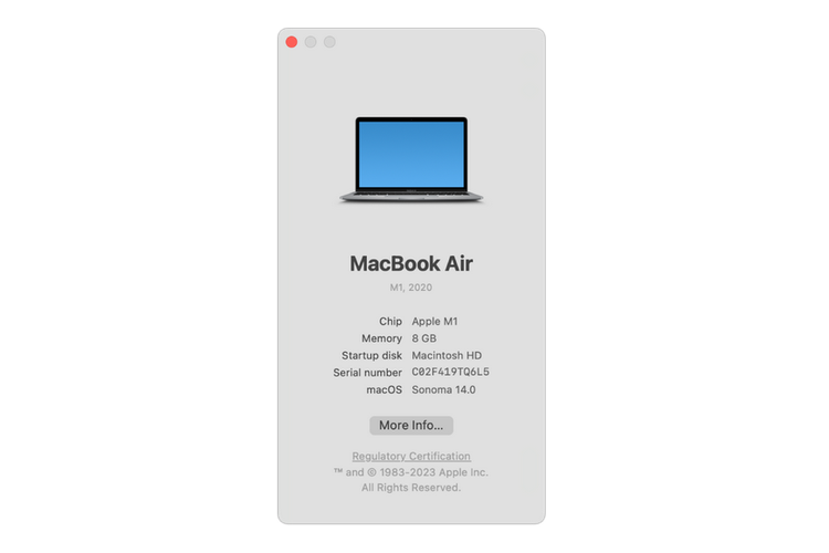 Terakhir,sistem bakal menampilkan model prosesor Macbook dan informasi singkat spesifikasi yang lain seperti kapasitas RAM dan versi sistem operasi.