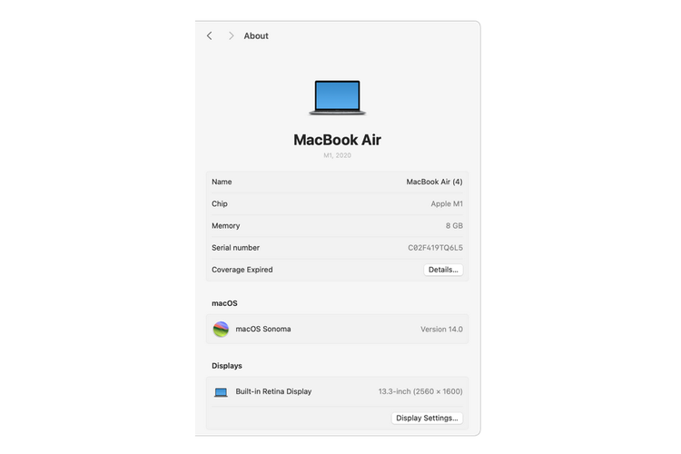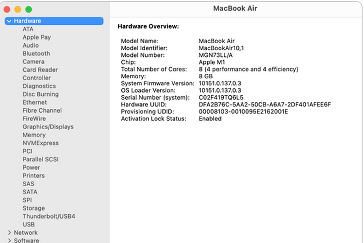 Selanjutnya,pengguna bakal bisa melihat daftar beberapa spesifikasi Macbook,termasuk model prosesor,jenis kartu grafis,jenis memori penyimpanan,kapasitas memori penyimpanan,kapasitas baterai,dan lainnya.