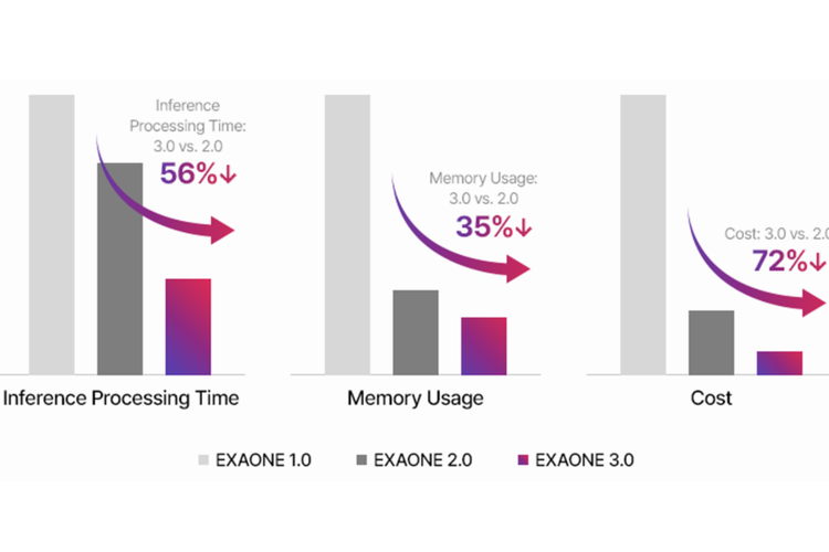 Exaone 3.0 memiliki waktu pemrosesan 56 persen lebih sedikit untuk inferensi,penggunaan memori 35 persen lebih sedikit,dan biaya pengoperasian 72 persen lebih rendah.