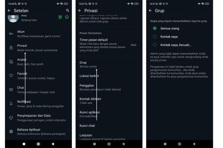 Secara default,pengaturan privasi grup WhatsApp sendiri berada di fitur “Everyone” yang mana seluruh kontak baik yang tersimpan maupun tidak dapat menambahkan Anda ke grup-grup tertentu dengan bebas.