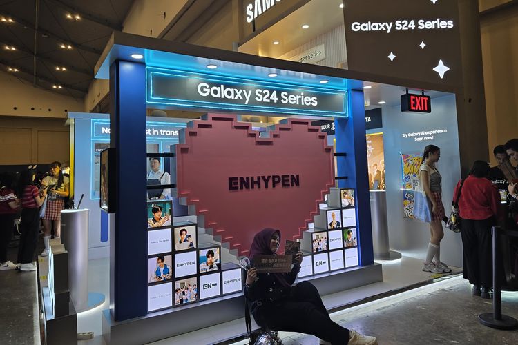 KOMPAS.com/Caroline Saskia Tanoto Samsung Galaxy S24 Ultra dipajang di booth konser Enhypen. Konser digelar di ICE BSD pada 17 dan 18 Agustus 2024.