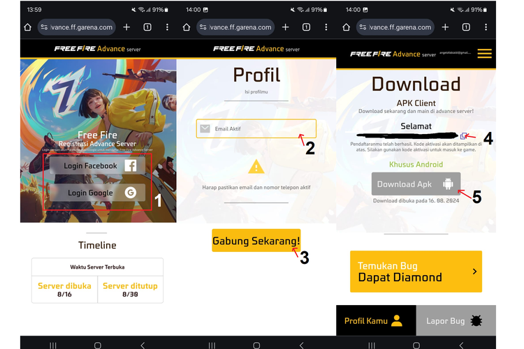 KOMPAS.com/Mikhaangelo Fabialdi Nurhapy Cara daftar Free Fire Advance Server periode Agustus 2024