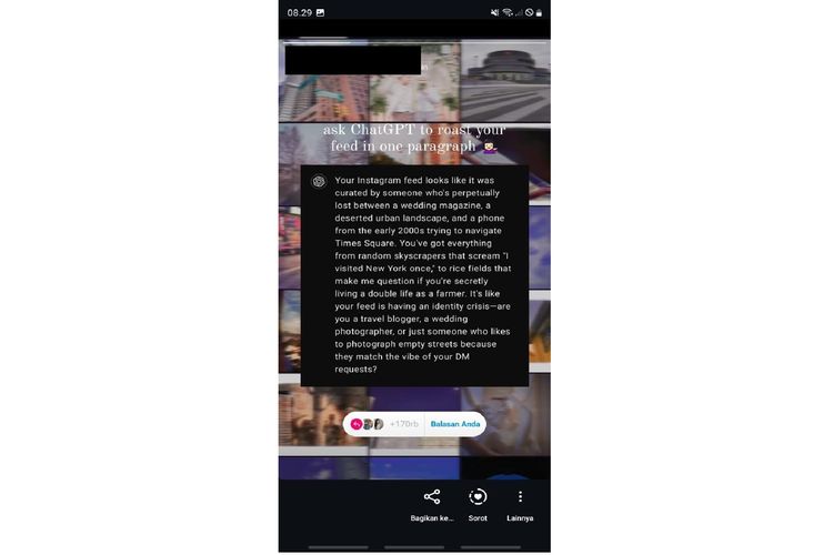 Sebagian dari Anda mungkin juga sudah melihat challenge “ChagtGPT roast my Instagram Feed” dibagikan di Story IG. Challenge ini ramai dibagikan di Story IG melalui fitur Add Yours untuk mengajak orang-orang.