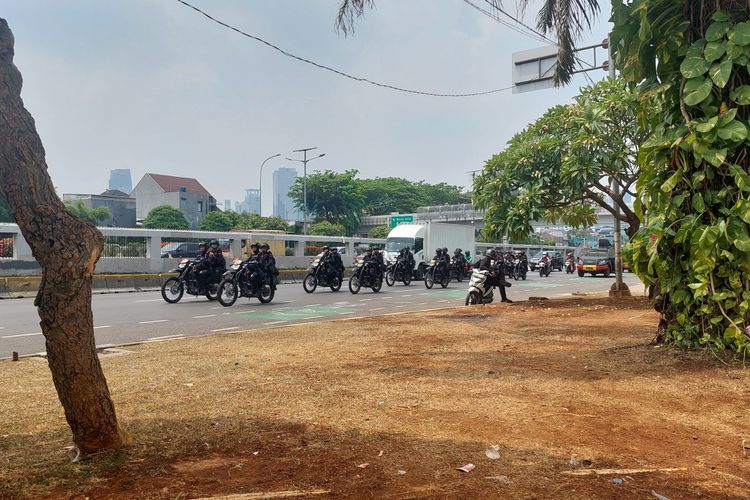 Pantauan Kompas.com,sekira pukul 11.24 WIB,belasan anggota Brimob menaiki motor trail dan kendaraan taktis menyusuriJalan Gatot Subroto,Senayan,Jakarta Pusat.