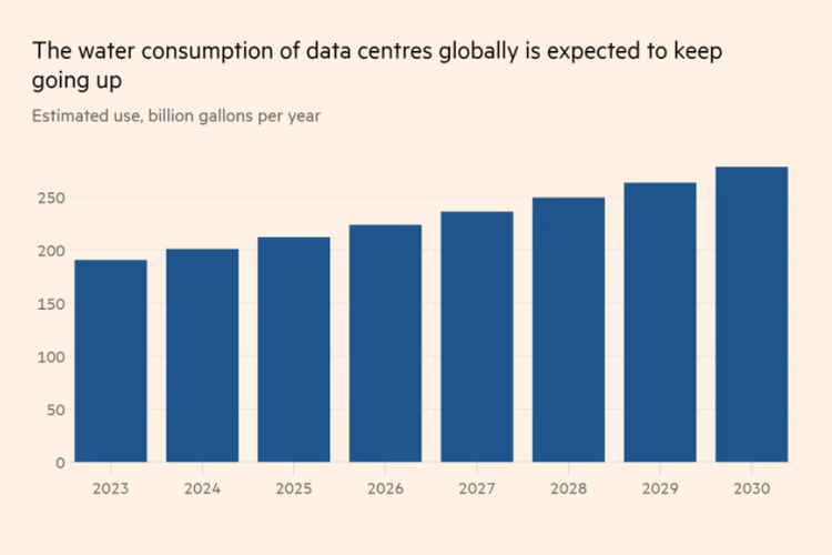 FinancialTimes Ilustrasi perkiraan konsumsi air untuk data center di seluruh dunia.