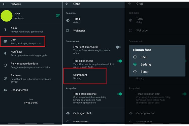 Cara yang pertama ini hanya akan mengubah ukuran huruf di chat atau ruang obrolan. Cara tersebut tidak akan mengubah ukuran huruf di keseluruhan tampilan ponsel. Jika hendak mengubah ukuran huruf di semua bagian,caranya bisa melalui menu pengaturan ponsel.