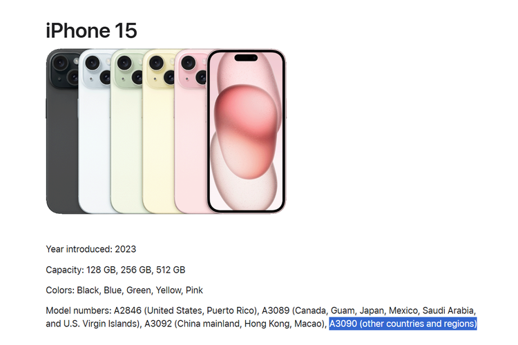 Apple Support Tangkapan layar iPhone 15 reguler dengan nomor model A3090 terdaftar dipasarkan untuk negara dan wilayah lain.