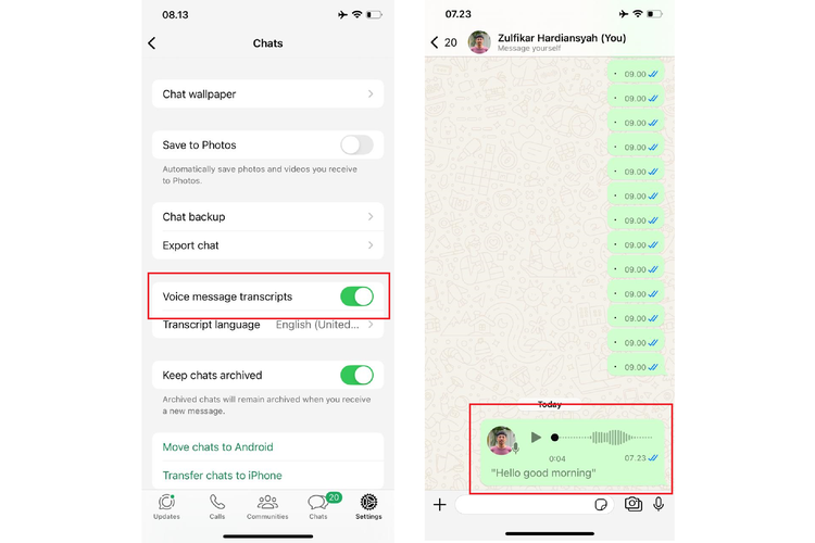 Saat fitur ini diaktifkan,audio pesan suara yang dikirim di ruang obrolan bisa disajikan dalam format teks. Jadi,selain mendengarkan audionya,pengguna bakal bisa juga membaca teks atas VN yang dikirim di ruang obrolan WhatsApp.