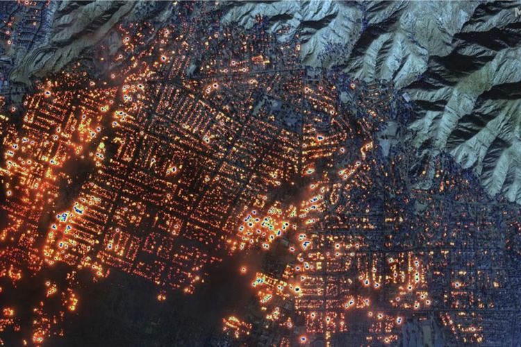 Di Altadena,di balik pegunungan di utara Los Angeles tempat kebakaran Eaton terjadi,citra satelit menunjukkan kobaran api yang melahap bangunan dan rumah warga.