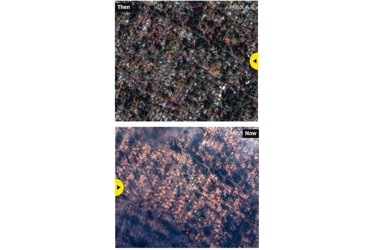 Maxar Technologies Citra satelit menunjukkan rumah-rumah di Altadena,dan kemudian pada tanggal 8 Januari hangus terbakar dan rata dengan tanah,serta tertutup asap.Penyebab kebakaran Los Angeles