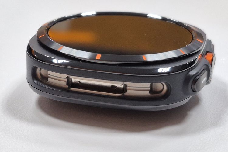 Pasalnya,Samsung Watch Ultra varian ini didominasi warna abu-abu,dikombinasikan dengan beberapa aksen berwarna oranye menyala. Selain itu,warna tali atau strap yang kami dapat juga oranye yang memunculkan kesan "sporty".