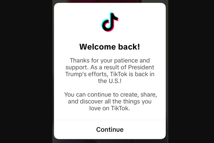 "Selamat datang kembali. Terima kasih untuk kesabaran dan dukungan Anda. Sebagai hasil dari upaya Presiden Trump,TikTok kembali hadir di AS. Anda bisa melanjutkan pembuatan,pembagian,dan penemuan konten apapun yang Anda sukai di TikTok”.