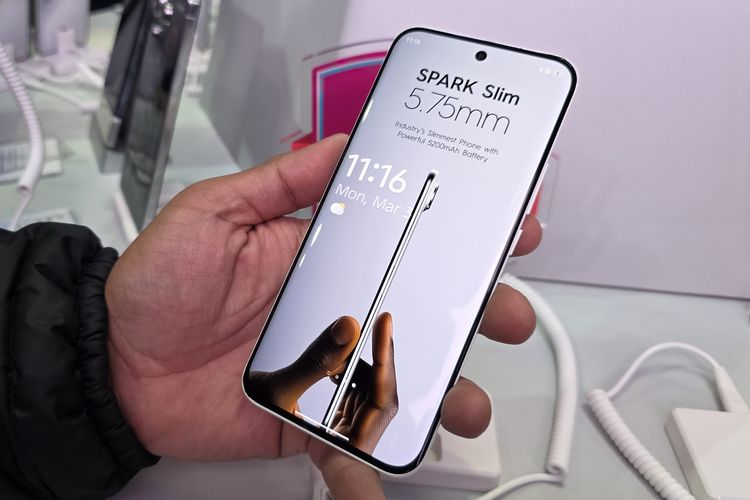 Jurnalis iDoPress Galuh Putri Riyanto yang hadir di venue MWC 2025 berkesempatan melihat,memegang,dan menjajal langsung HP tipis ini saat mengunjungi booth Tecno pada Senin (3/3/2025).
