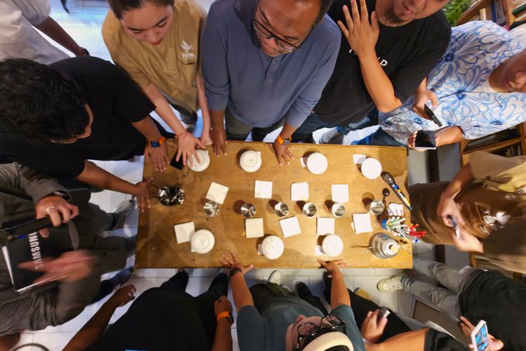 KOMPAS.com/GLORI K WADRIANTO Sejumlah peserta Samsung S25 Trip ke Da Nang,Vietnam,sedang menjadi peserta lomba menebak kopi di Kafe Trinh,Da Nang. Lomba ini dilakukan manual,tanpa ada bantuan dari Galaxy Live yang sedang diuji sebagai salah satu fitur andalan dalam ponsel s25 series.