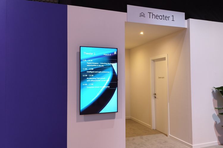 Kompas.com/BILL CLINTEN Tampilan ruangan Theater di booth Ericsson di MWC 2025.