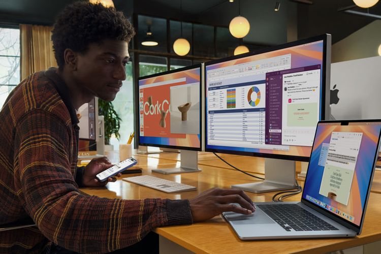 Apple Ilustrasi menggunakan MacBook Air M4 2025 yang sudah mendukung dua layar eksternal beresolusi 6K sebagai layar tambahan